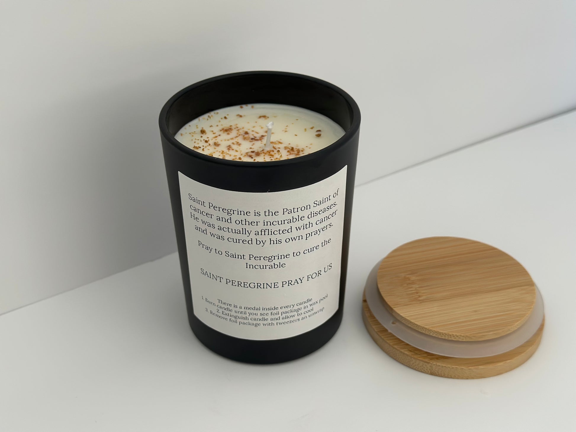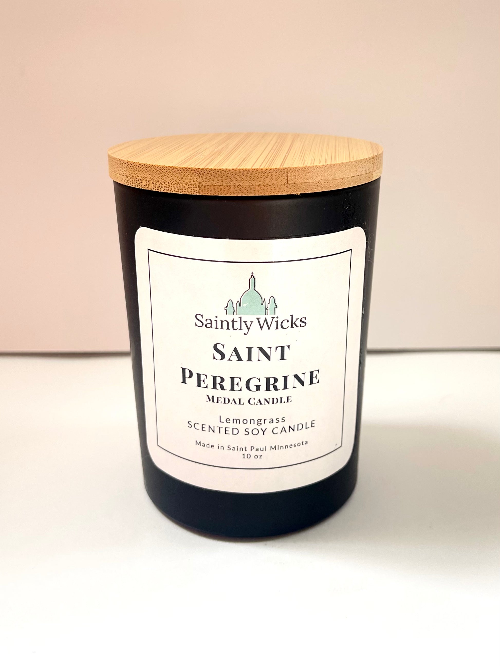 Lemongrass scented candle with a Saint Peregrine medal hidden inside.